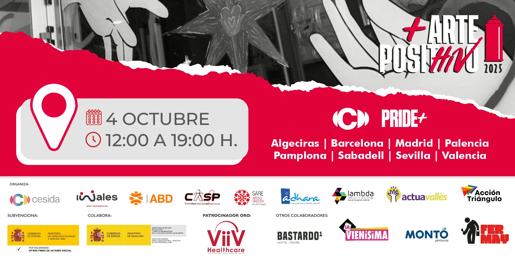 Arte Positivo se celebrará de manera simultánea en ocho ciudades españolas: Sevilla, Algeciras, Barcelona, Madrid, Palencia, Pamplona, Sabadell y Valencia, con la participación de más de 70 artistas. Este despliegue convierte al proyecto en una de las iniciativas culturales más ambiciosas del país en torno a la salud, la diversidad y los derechos humanos. Las obras estarán expuestas durante toda una semana, y algunas podrán visitarse hasta el domingo 19 de octubre.