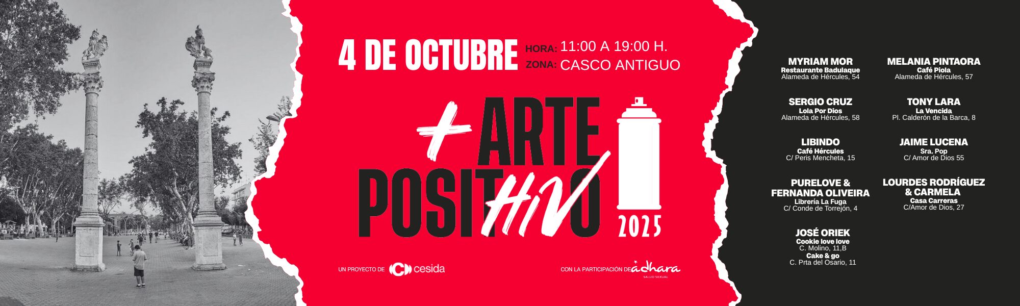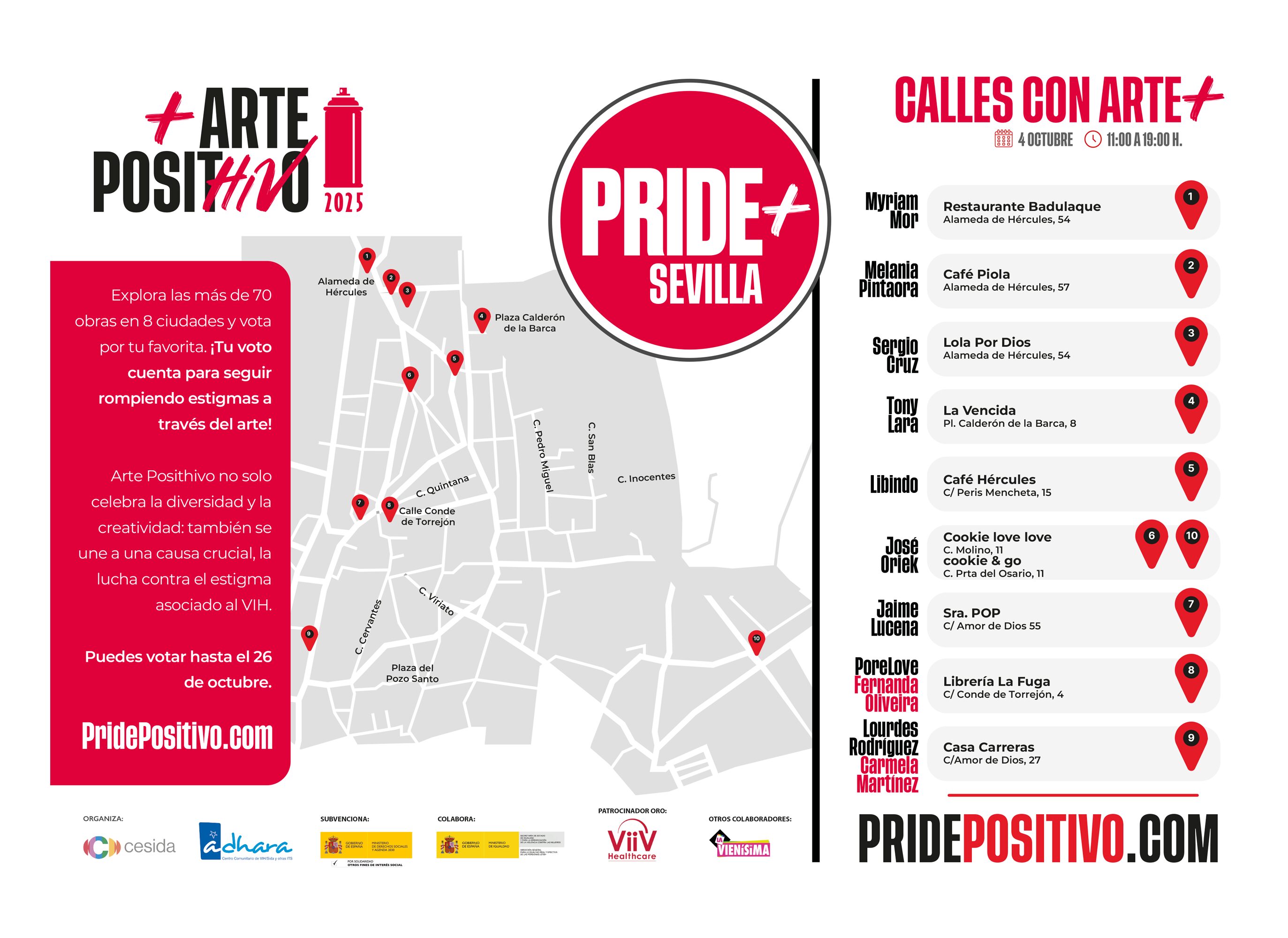 Los locales que acogerán las intervenciones artísticas en Sevilla son: Taberna La Vencida, Librería La Fuga, Casa Carreras, Café Hércules, Café Piola, Restaurante Badulaque, Sra. POP, Cookie Love Love, Cakes & Go y Lola Por Dios. Para facilitar el recorrido, la organización ha puesto a disposición del público un mapa en la web www.cesida.org/pridepositivo, que señala cada uno de los espacios donde se podrán descubrir las propuestas artísticas.