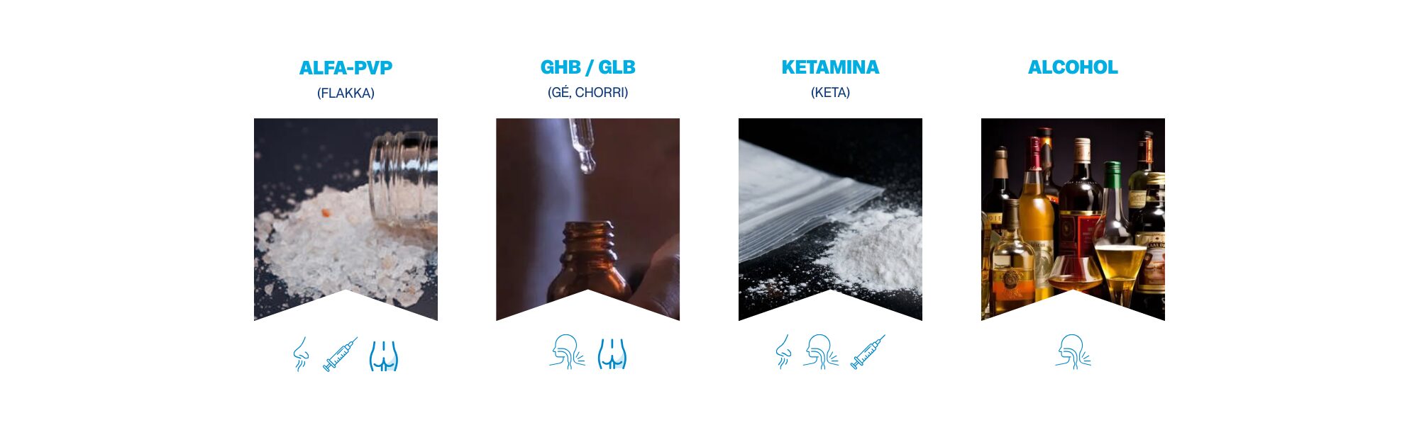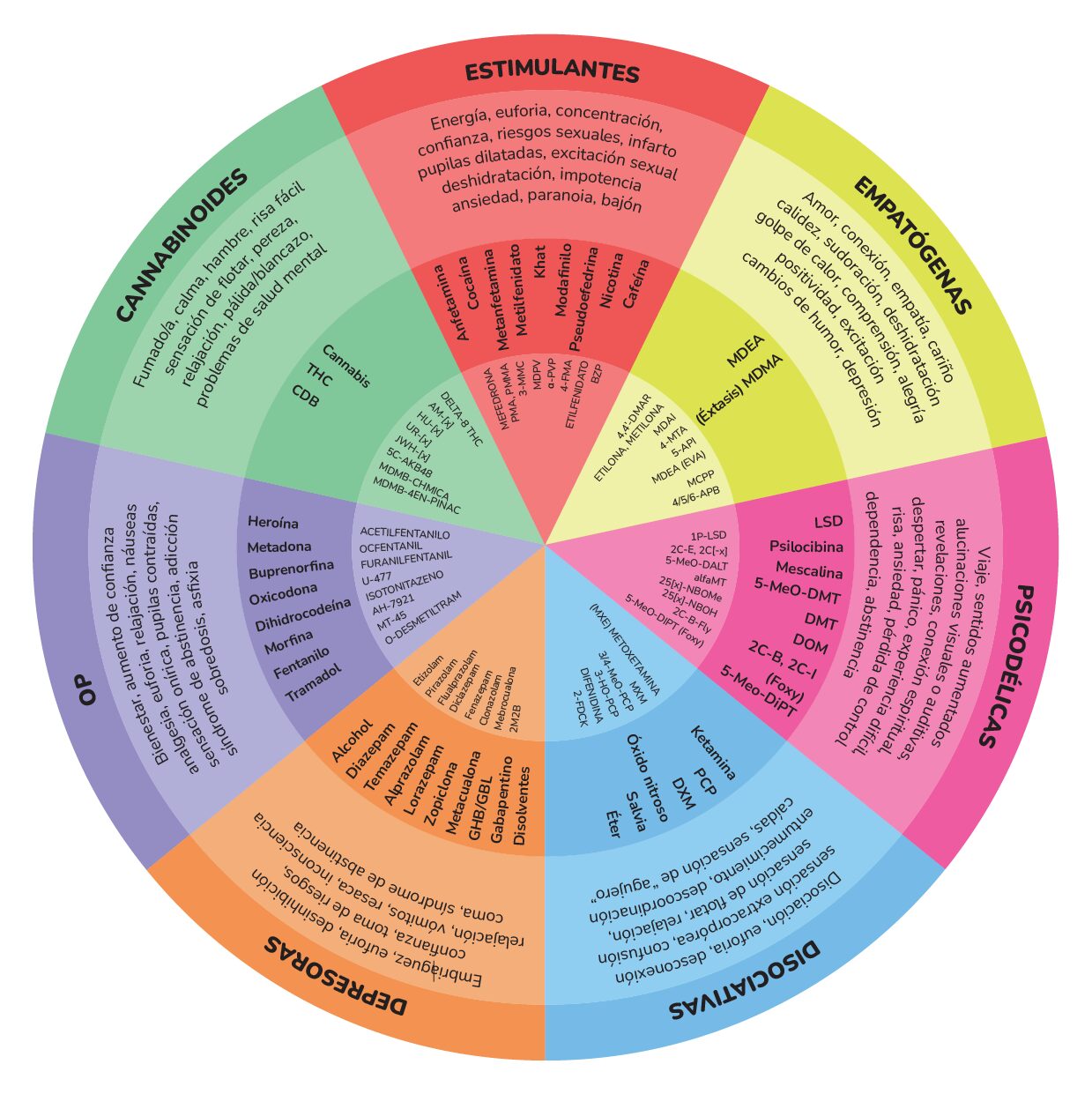 - Depresoras: GHB/GBL (Ge, bote, chorri), alcohol, cannabis.